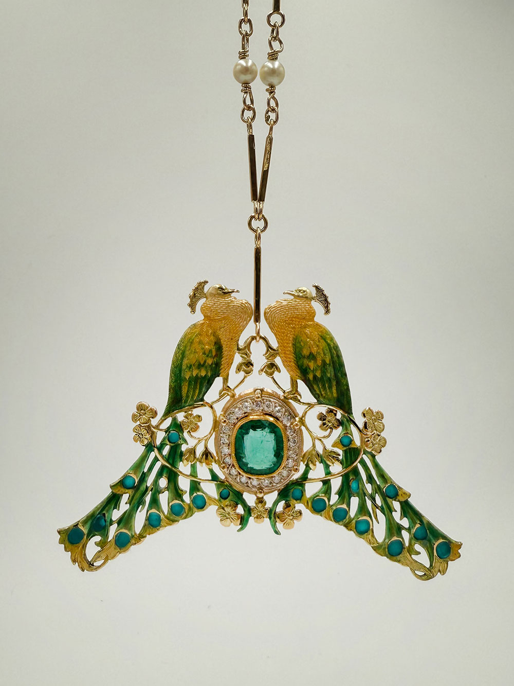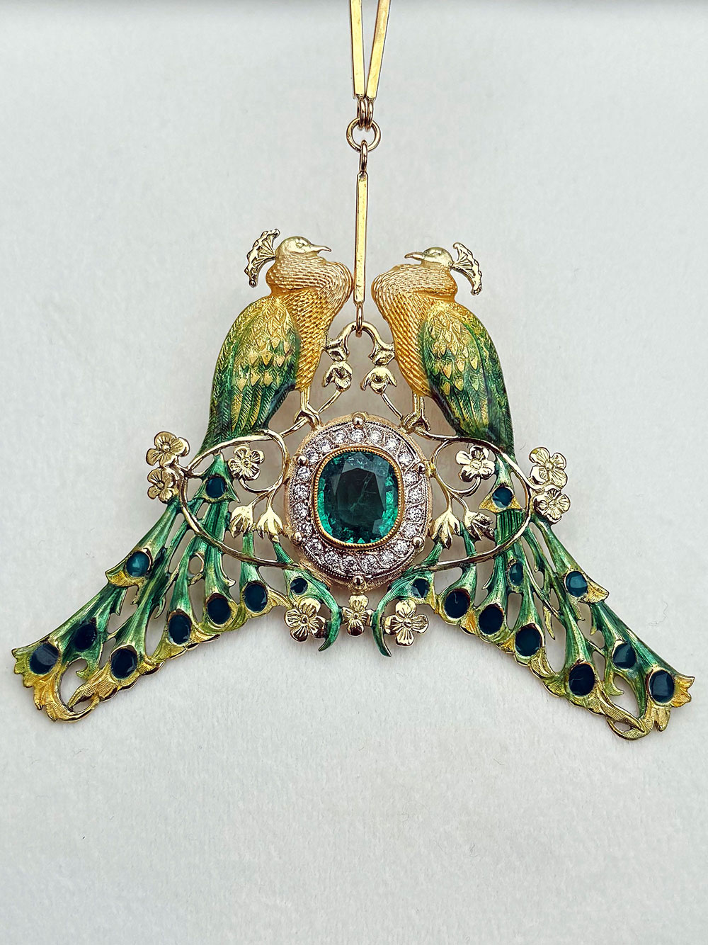 Ekskluzywny, unikatowy naszyjnik z ręcznie emaliowanego złota, zdobiony szmaragdem 6,68 ct oraz 21