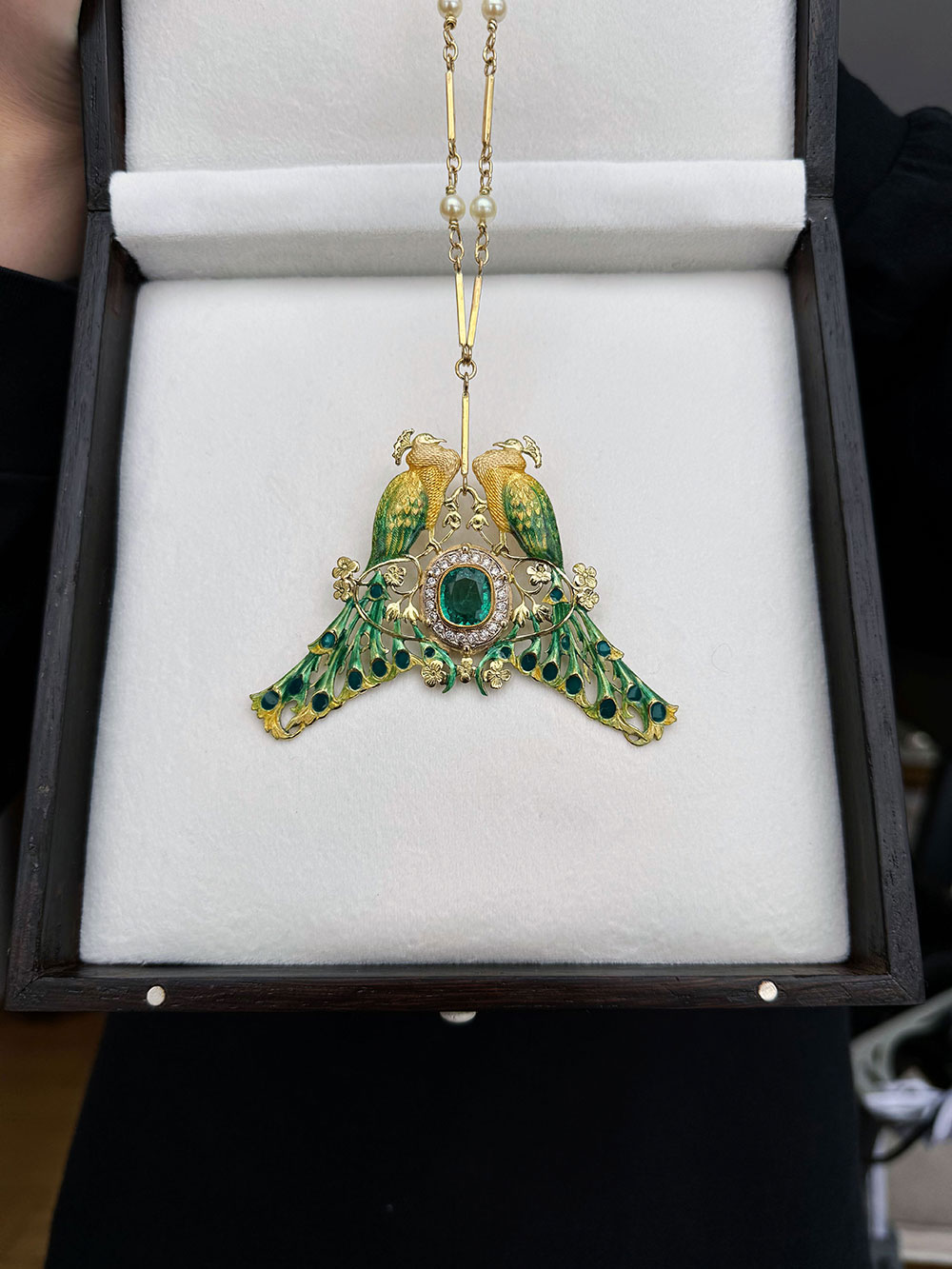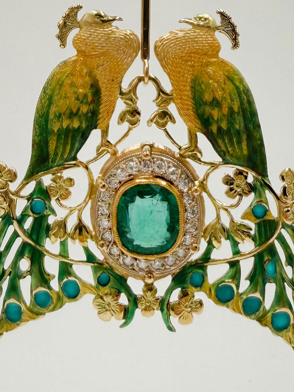malowanej emalii, która zdobi dwa majestatyczne ptaki oraz delikatne florystyczne motywy. W centrum