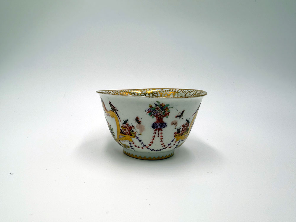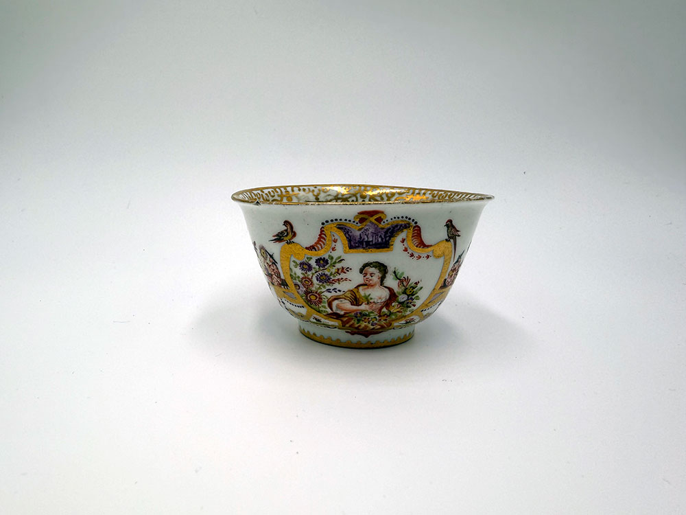 Dekoracja filiżanki przedstawia wyrafinowaną kompozycję groteskową z elementami fantastycznymi. Centralnym punktem jest bista kobieca, otoczona złoconym, ornamentalnym kartuszem w stylu rocaille. Po obu stronach rozciągają się stylizowane wstęgi z ptakami, liśćmi akantu i subtelnymi detalami roślinnymi, co nadaje kompozycji lekkości i dekoracyjnej elegancji.