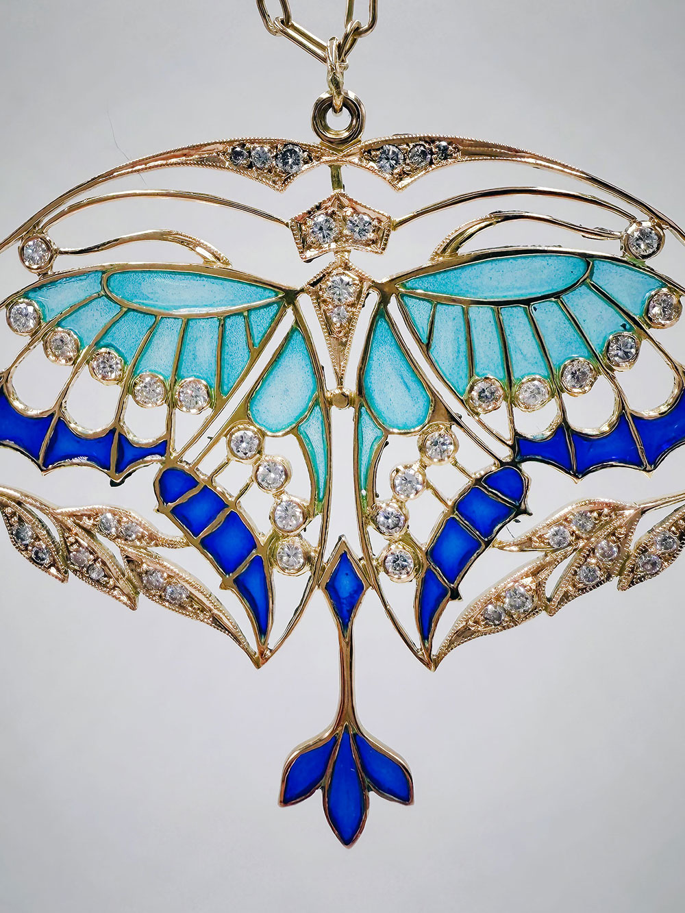 detale przy użyciu rzadkiej techniki emaliowania złota, często nazywanej „plique-à-jour”. Ten wyjątkowy