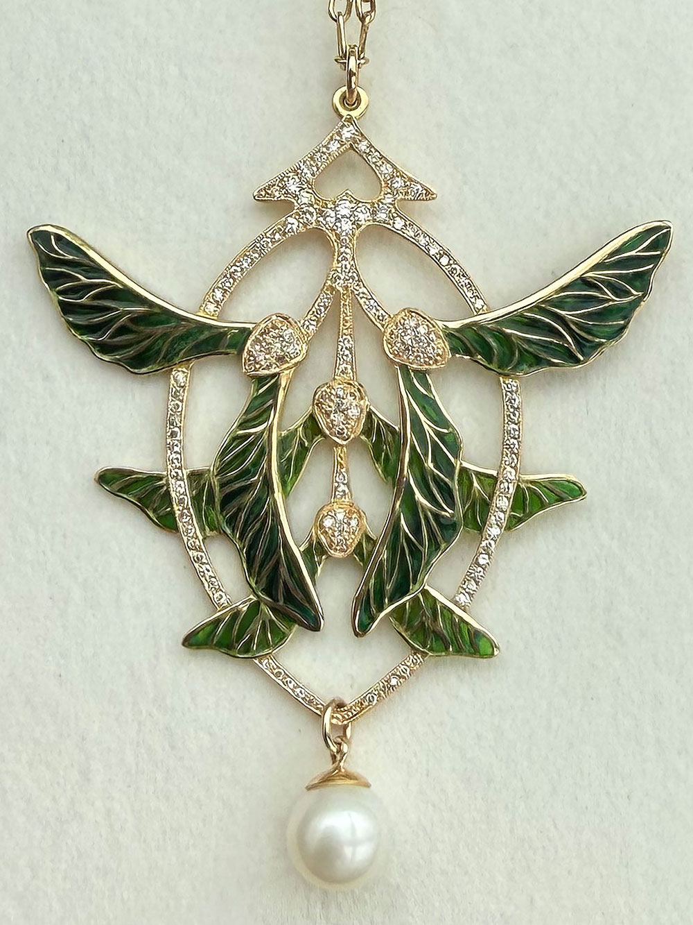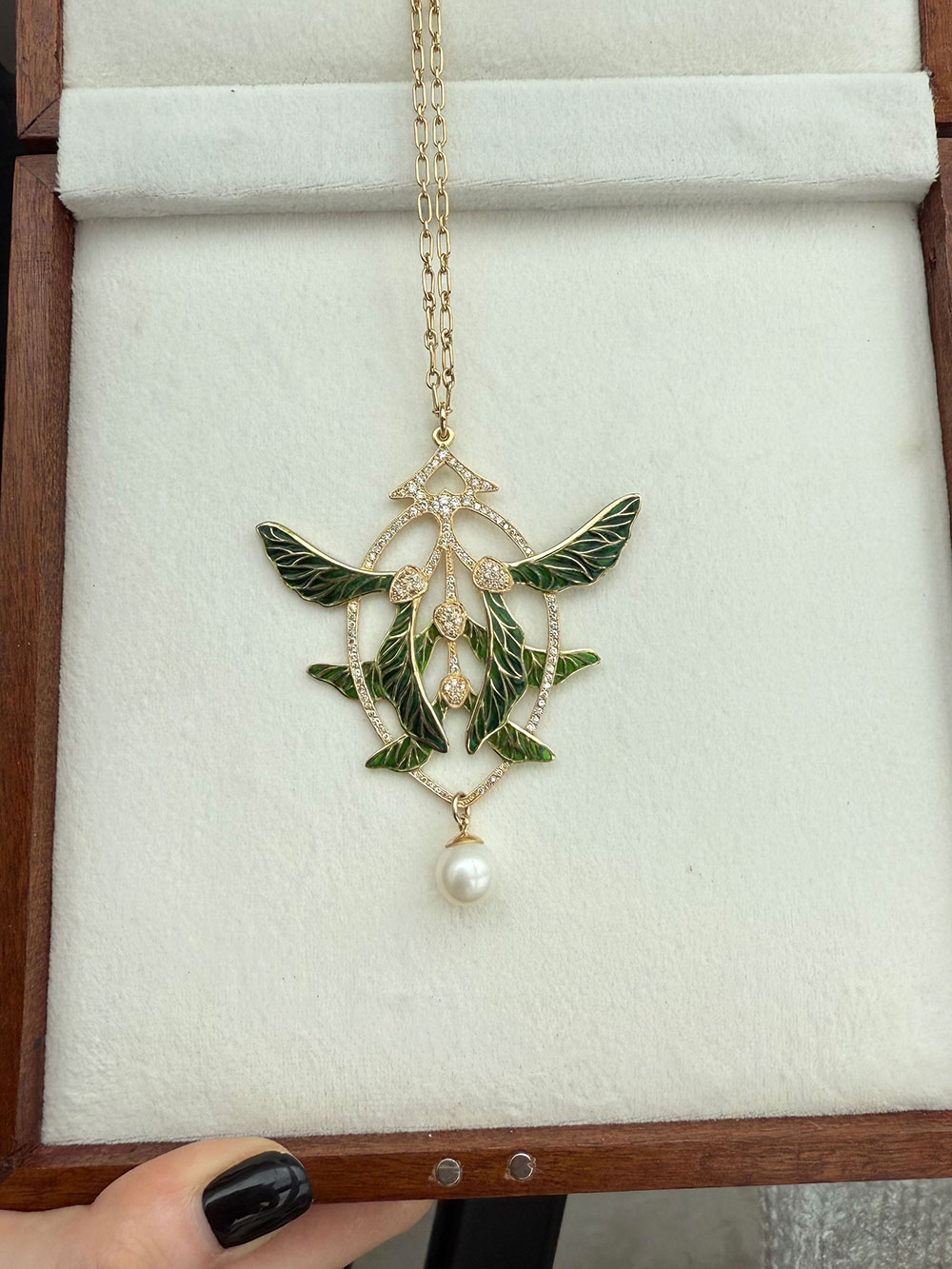 przywołując na myśl wyrafinowane dzieła epoki secesji. Głębokie, zielone emaliowane liście, precyzyjnie
