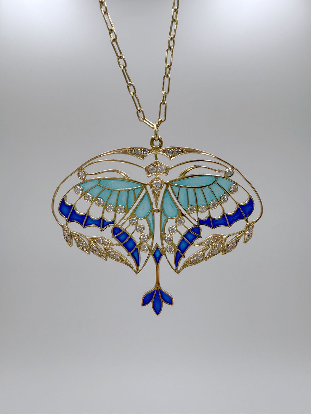 detale przy użyciu rzadkiej techniki emaliowania złota, często nazywanej „plique-à-jour”. Ten wyjątkowy
