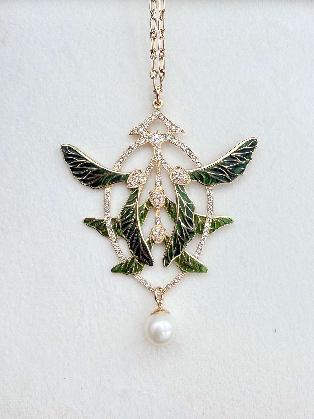 przywołując na myśl wyrafinowane dzieła epoki secesji. Głębokie, zielone emaliowane liście, precyzyjnie